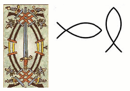 | That annoying fish symbol the Christians use has also been stolen and corrupted. It is called a "yoni" and the Christians turned it on its side. It is really a vagina and its correct position is seen here at left. The yoni is a very ancient symbol and can be seen in many old decks of Tarot cards, as is pictured here. |